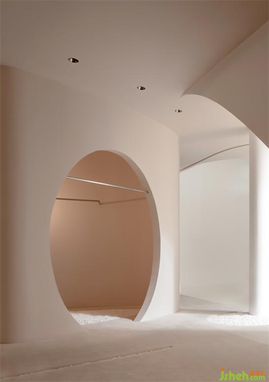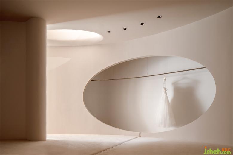 我們想把婚紗作為空間的主體去襯托,而白色作為婚紗的主色系,我們有刻意規(guī)避白色去營造空間圣潔的氛圍,高定空間設計以大面積的裸色去迎合和凸顯婚紗的氣質(zhì)。
