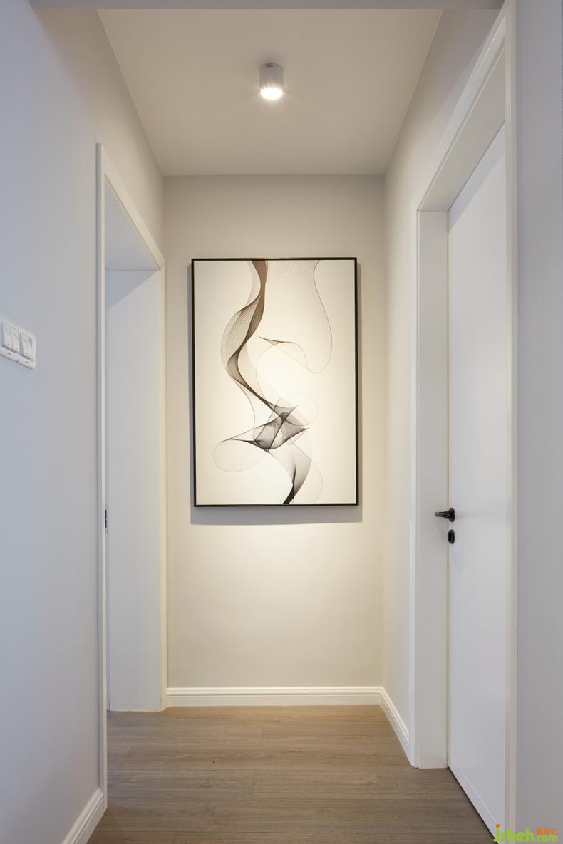 入戶:左側(cè)為餐廳,右側(cè)為客廳,正對著端景墻以一副現(xiàn)代抽象畫為點綴。在設(shè)計手法上跳出傳統(tǒng)屏風(fēng)隔斷形成的小玄關(guān),而采取畫龍點睛手法將目光引向過道端景墻。視野的延伸性,即是想表現(xiàn)的重點。