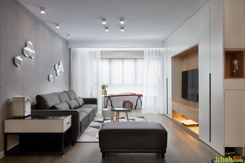 活動家具采用深淺冷色系搭配,改變大面積深色展現(xiàn)。深灰的皮沙發(fā),淺灰和白色的組合茶幾,中灰色調(diào)的藝術(shù)涂料背景,都被幾何圖案的灰調(diào)地毯襯托的更有清靜感。