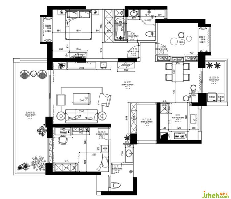 本戶型原始結(jié)構(gòu)屬于方正戶型,南北通透,采光良好,行動(dòng)路線清晰。缺點(diǎn)是入戶玄關(guān)沒(méi)有獨(dú)立空間,進(jìn)門直接對(duì)著客廳。公衛(wèi)過(guò)于狹小,洗手臺(tái)空間緊湊。餐廳空間沒(méi)有餐邊柜收納空間等。本案設(shè)計(jì)中重點(diǎn)突出收納與裝飾優(yōu)化設(shè)計(jì),通過(guò)最終案例體現(xiàn)出,設(shè)計(jì)就是讓一套房子更加適合他的居住者。