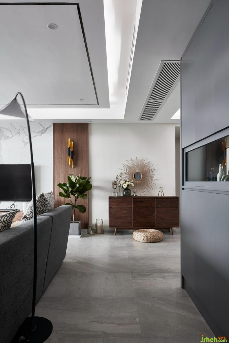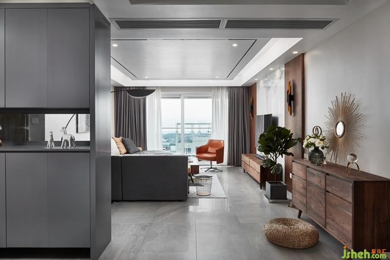 入戶玄關(guān)在保證有大空間的收納功能,又要兼顧到玄關(guān)區(qū)的采光,在鞋柜的結(jié)構(gòu)上解決。中間的鏤空位用加厚的鋼化玻璃,通過(guò)玻璃采光又可以保證結(jié)構(gòu)的穩(wěn)固度。地面磚低調(diào)的灰色花紋與深灰色鞋柜面板呼應(yīng),協(xié)調(diào)的美感就在這一瞬間體現(xiàn)出來(lái)。設(shè)計(jì)公司