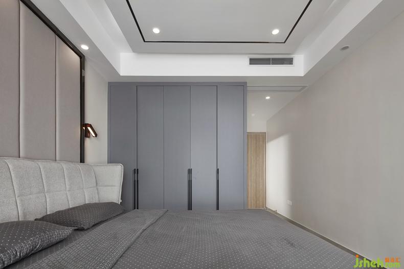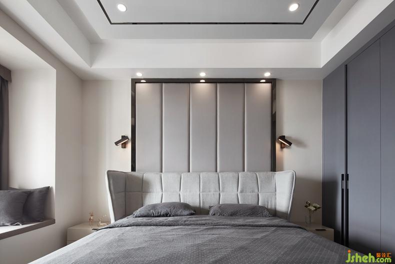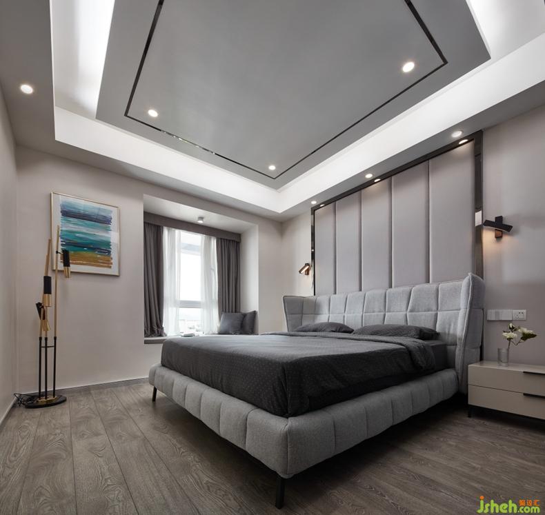 主臥設計中同樣取消主燈,天花吊頂設計中體現(xiàn)的暗藏燈帶,讓空間的光照都是自然舒適。主臥背景采用軟裝設計,簡潔明快的線條呼應天花吊頂,質感的金屬收邊條更加體現(xiàn)輕奢的低調。