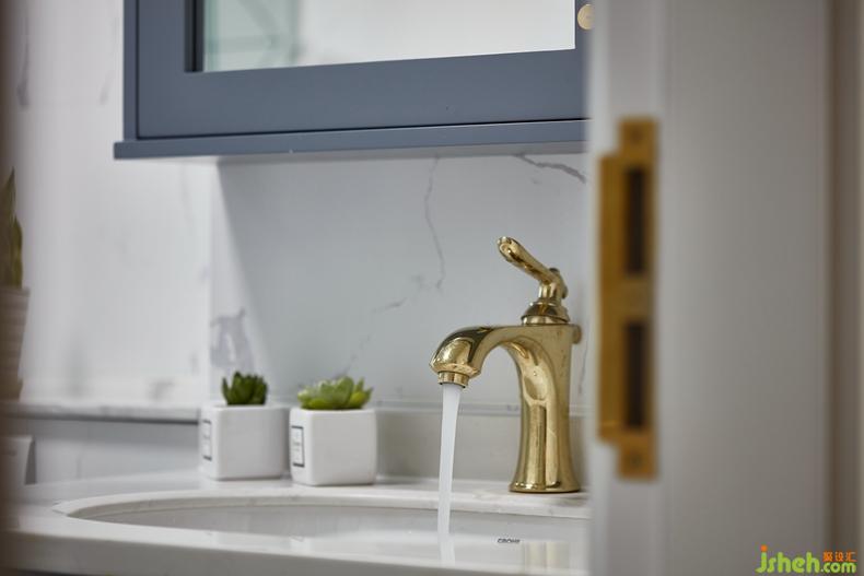 墻面統(tǒng)一的仿爵士白瓷磚,自然的紋理不需要刻意挑選,隨意的混鋪更加能體現自然的延伸。定制的灰藍色洗手臺配上金色水龍頭,此時金屬的質感最容易讓人流連忘返。