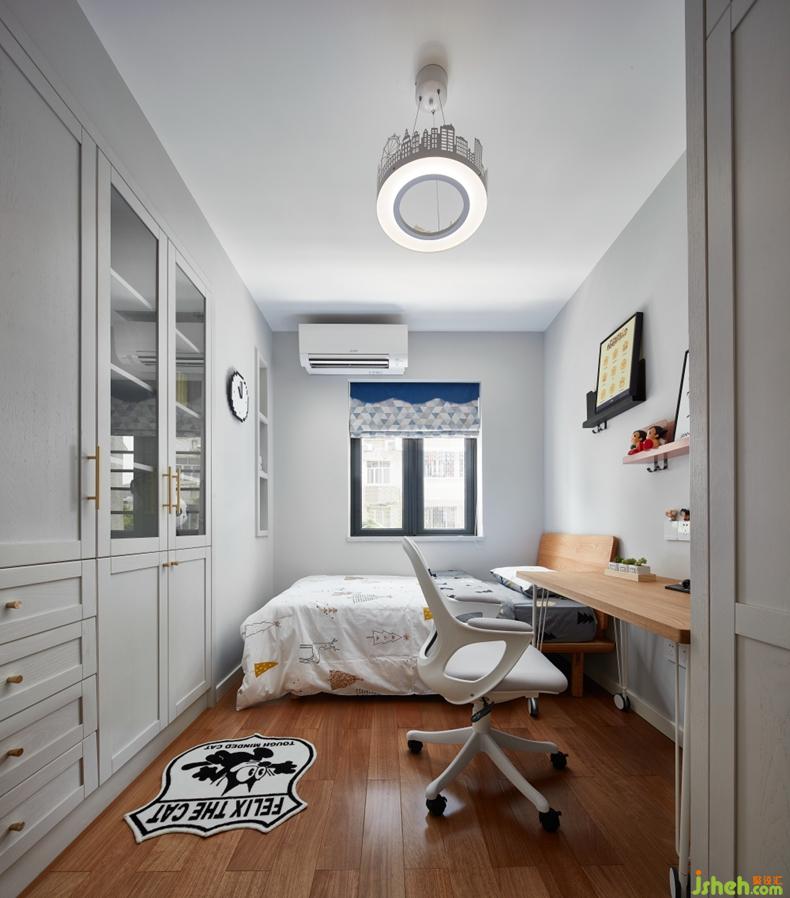 小孩房的設計中采用簡潔的手法,一改傳統(tǒng)卡通墻面,彩色墻面等熟透的標記。軟裝靈活的點綴出小男孩調皮活潑且?guī)в袎粝氲目臻g。