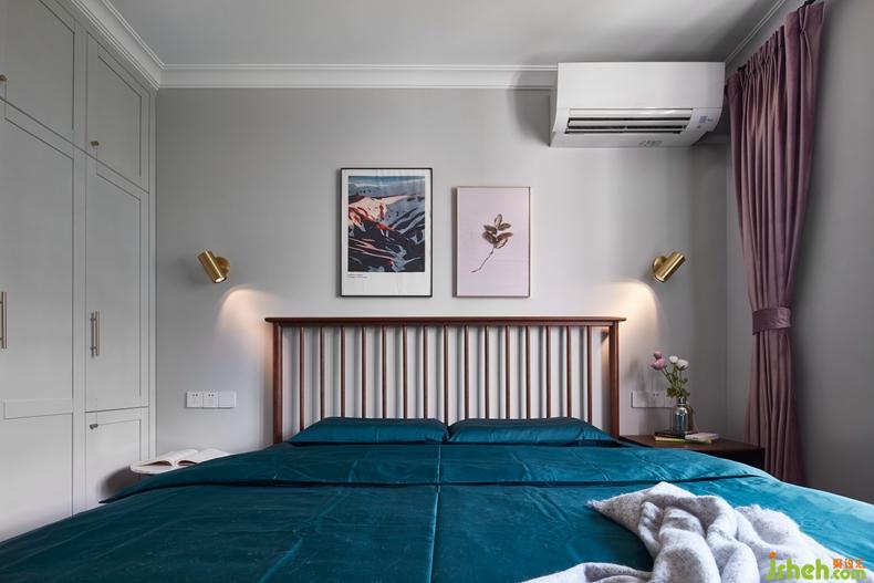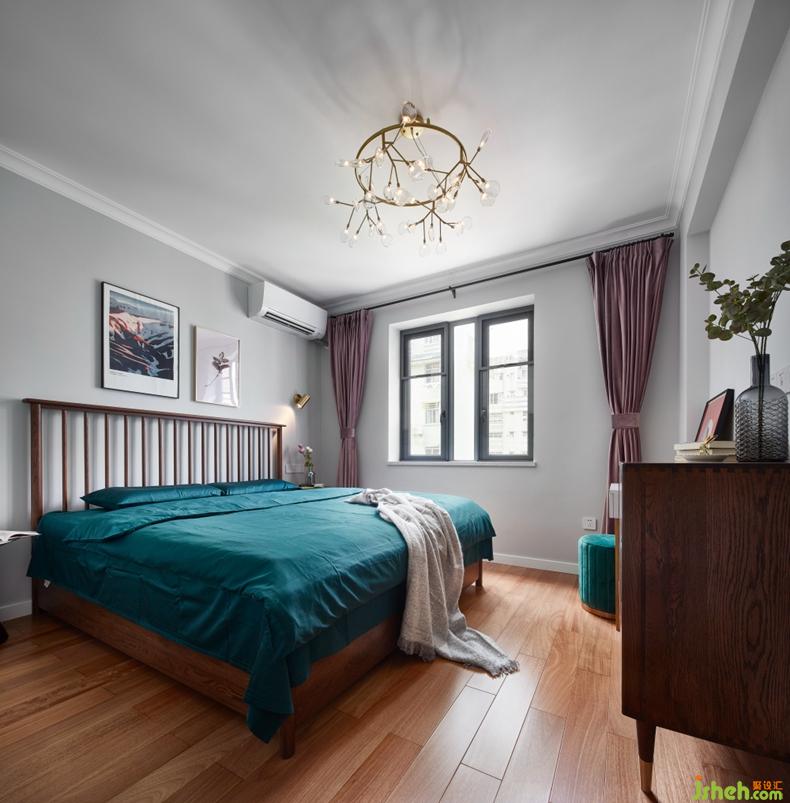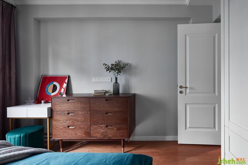 主臥的設計中體現(xiàn)了主人穩(wěn)重內斂的氣質,黑胡桃木色的實木床及斗柜,在墨綠色床品的襯托下顯得更加有質感。金屬的壁燈及裝飾畫框,在灰色墻面上顯現(xiàn)高貴的氣質。