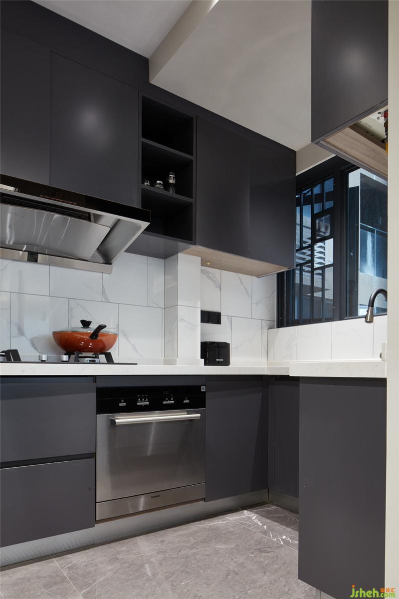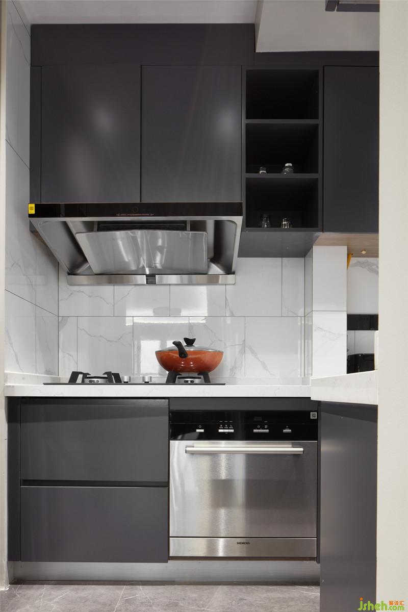 廚房沿用客餐廳色系,給廚房與餐廳間的協(xié)調(diào)增加整體感?;疑喖s無拉手柜門,仿爵士白瓷磚的灰色紋理與柜門既有對(duì)比又有呼應(yīng),美體現(xiàn)在看似不經(jīng)意的細(xì)節(jié)中。