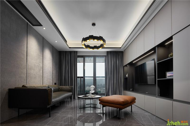 客廳沙發(fā)背景墻的豎塊狀硬包背景,布藝的細(xì)膩質(zhì)感與電視組合柜的硬朗形成對(duì)比。硬包邊上黑色的金屬收邊條又與電視背景柜中的黑色呼應(yīng),視覺的整體效果,需要在材質(zhì),色彩,造型等方面都要全面考慮。