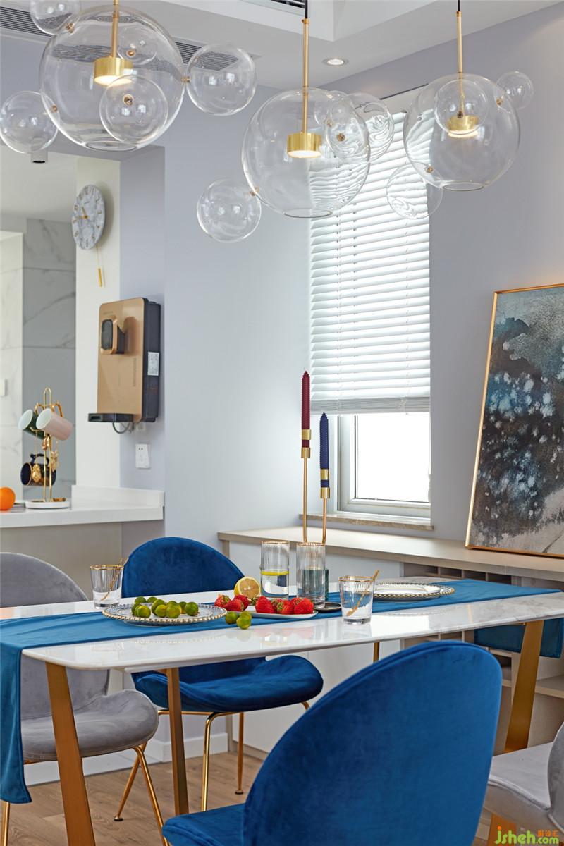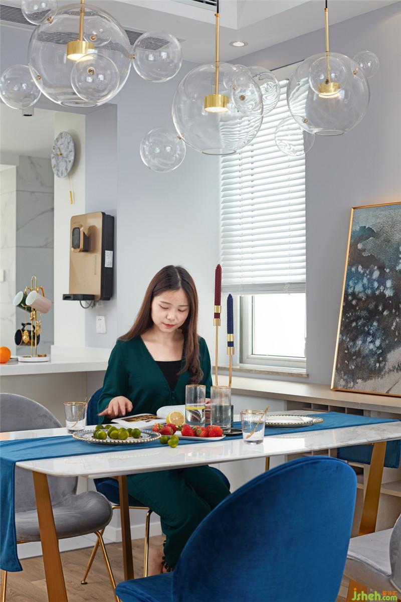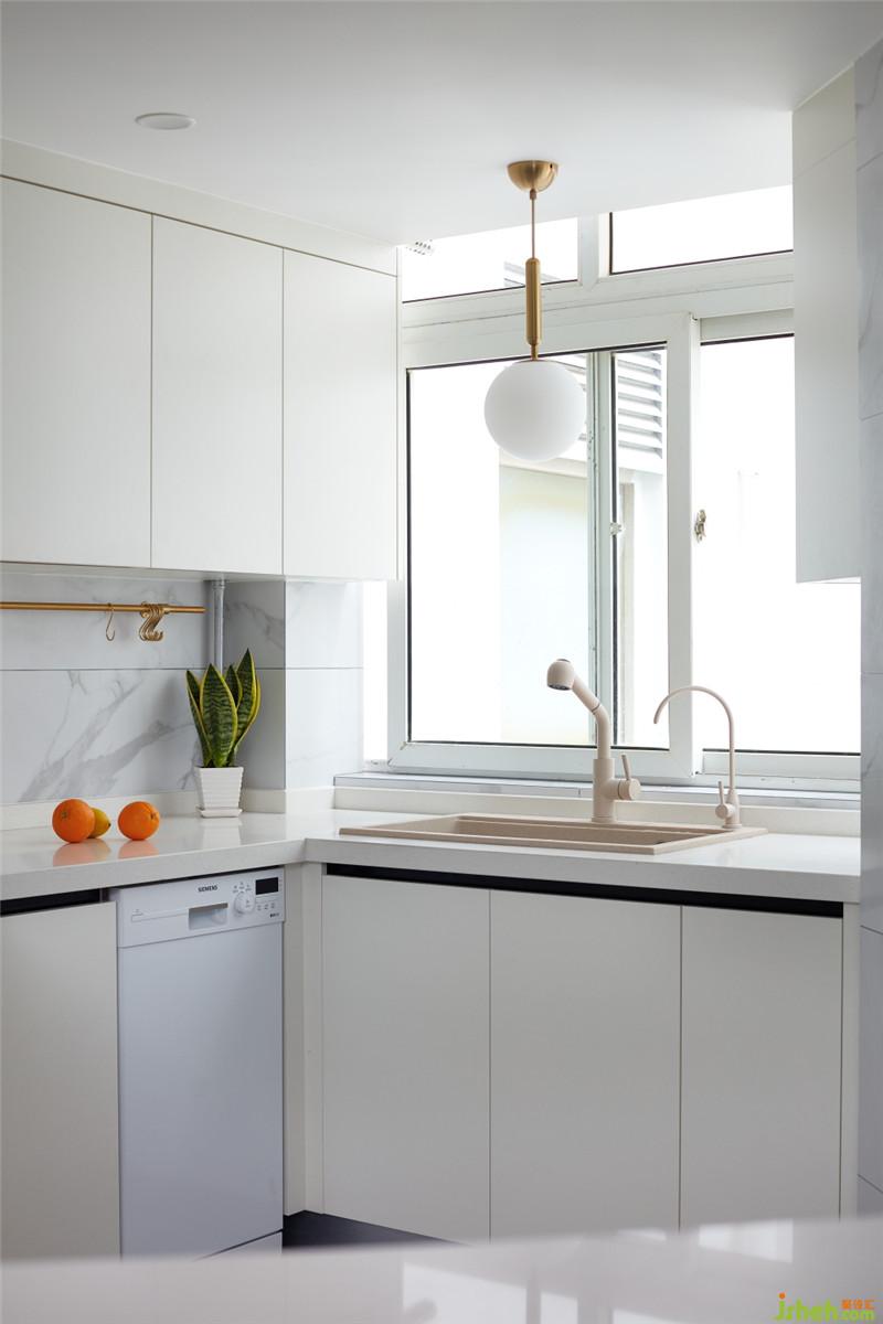 廚房的墻面與地面采用相同的柔光仿爵士白瓷磚,讓空間的視覺(jué)達(dá)到整體化一。白色的櫥柜,白色的臺(tái)面,沒(méi)有過(guò)多復(fù)雜的點(diǎn)綴,清新之風(fēng)迎面而來(lái)。