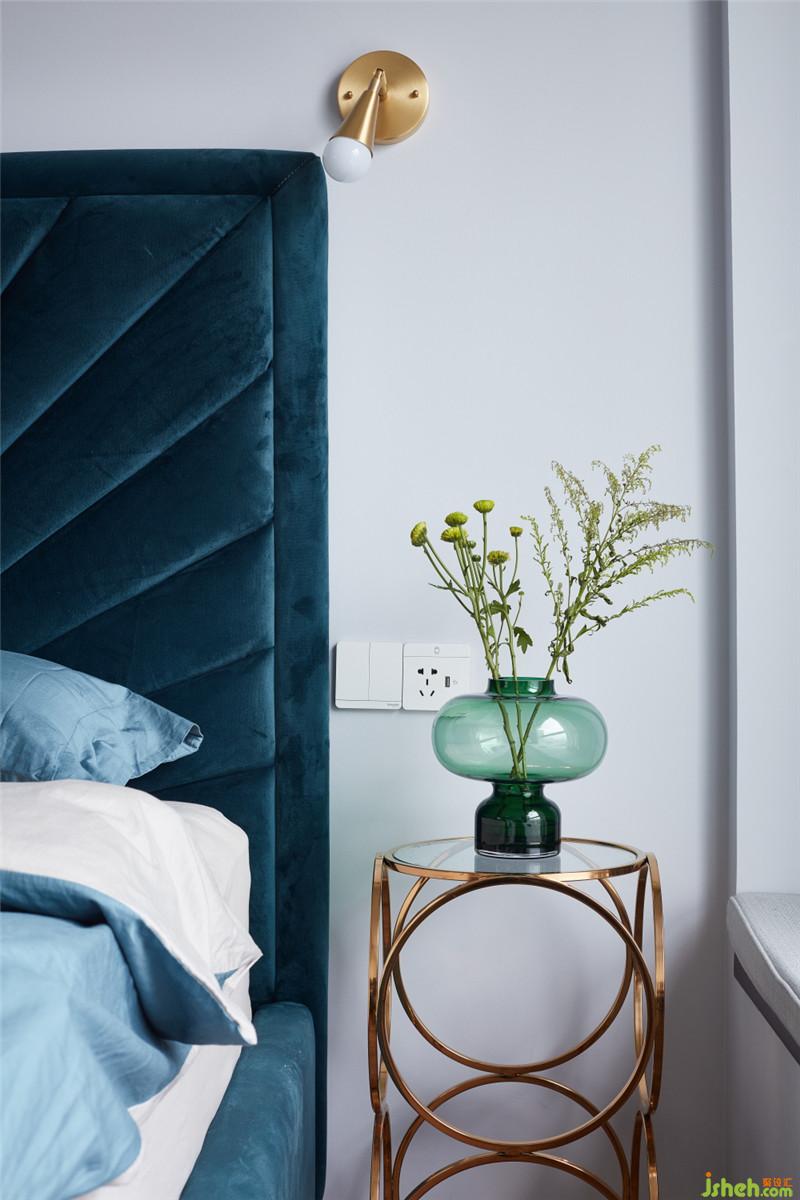 主臥床的靠背本身就是一道裝飾的背景,所以在設(shè)計墻面中采用了色塊搭配的處理手法。藕粉色的色塊,讓整個空間有了一道亮麗的風(fēng)景線。粉與墨綠的搭配也讓空間的層次多了一道體現(xiàn)。精致的金色床頭壁燈與金色的羽毛主燈相互呼應(yīng),給空間帶來了品味柔美的一面。