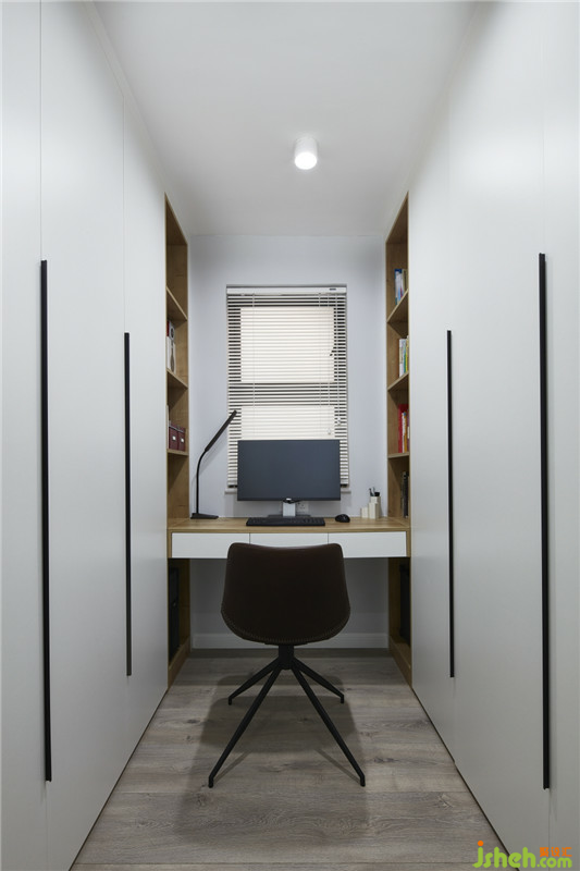 主衛(wèi)的舍棄,給予了多功能衣帽間的空間。書桌靠窗,左右兩側(cè)做書架收納,方便實(shí)用滿足了書房的需求。 書桌右側(cè)書架的背面,利用柜子的深度,做了一面收納書架,又完全滿足梳妝臺(tái)的收納需求。每個(gè)空間都有各自的需求,每個(gè)空間又可以完美的發(fā)揮作用。