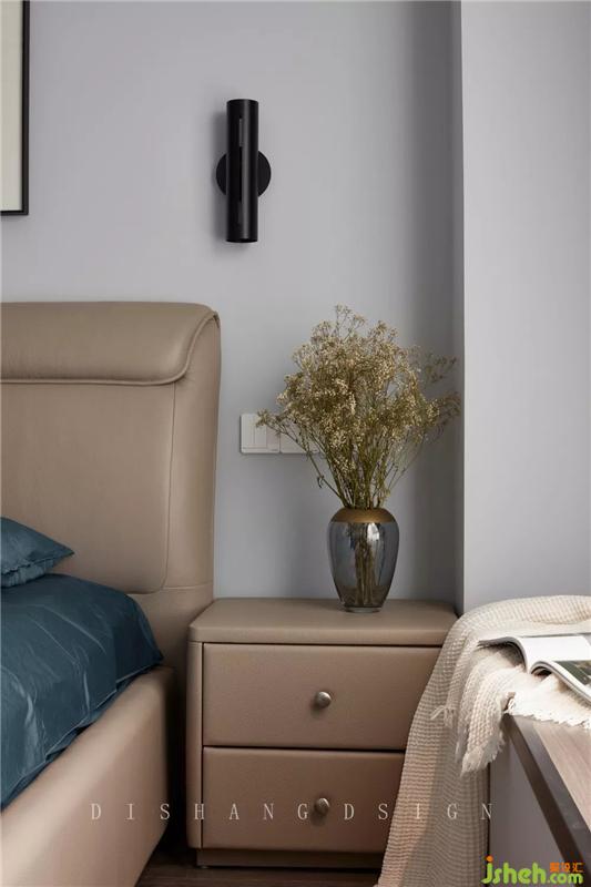 米色系的簡(jiǎn)約真皮大床與床頭充滿質(zhì)感,配以柔軟舒適的藍(lán)色床品,不論是顏色還是材質(zhì)上,對(duì)比明確,但卻具有舒適與美觀并存的享受。室內(nèi)設(shè)計(jì)師
