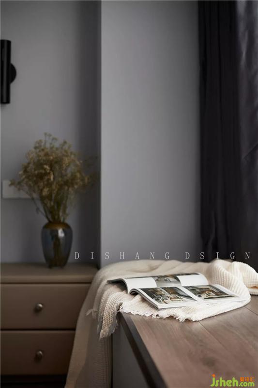 次臥黑胡桃木梳妝臺(tái)、藍(lán)色床品與淺灰色產(chǎn)生強(qiáng)烈的對(duì)比,給人一種時(shí)尚前衛(wèi)的感覺(jué)。室內(nèi)設(shè)計(jì)師