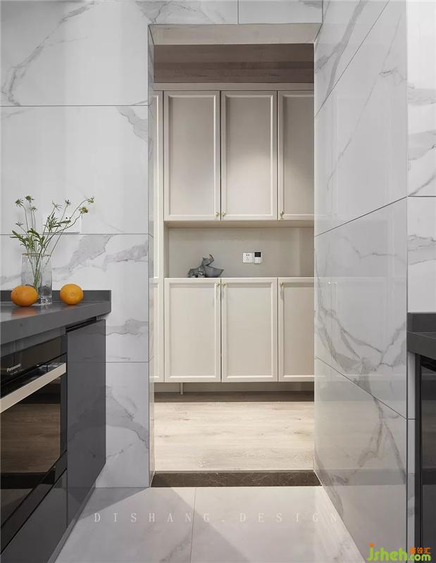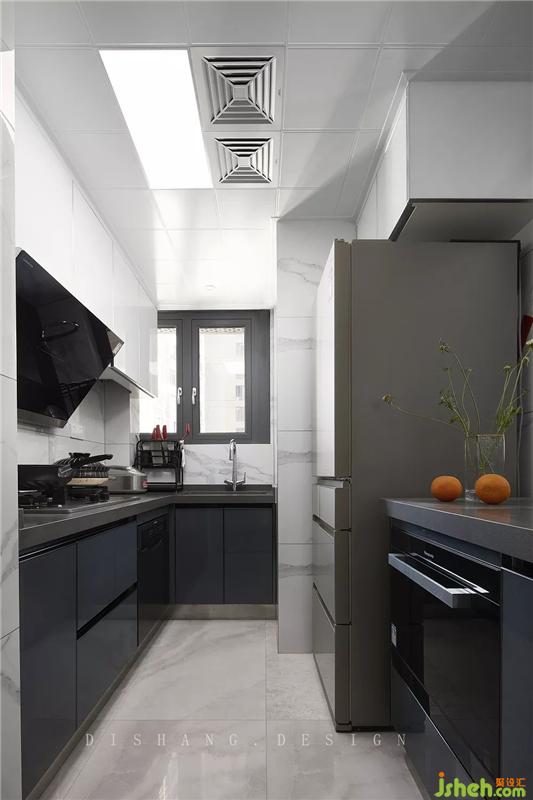 廚房空間較小,我們優(yōu)化空間格局,拆掉廚房與生活陽臺的原有墻體,擴(kuò)大廚房面積,提高其收納功能。裝修設(shè)計(jì)