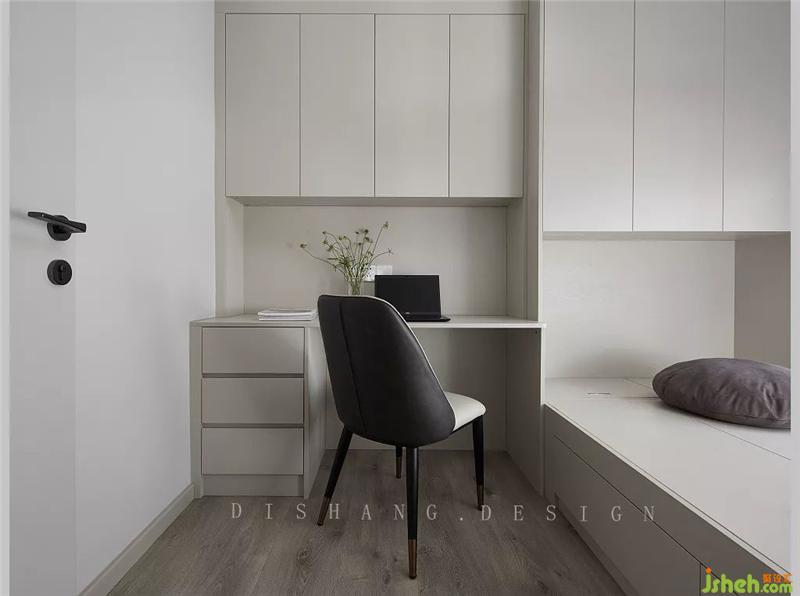 整個書房沒有多余的裝飾,只有榻榻米連體書柜組合?;野咨{(diào)的留白空間,更能讓人靜下心,集中注意力去思考。