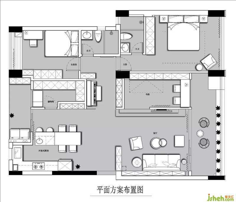 合理利用空間,增強空間之間的聯(lián)系與互動性,重點為客廳與書房、餐廳與廚房: