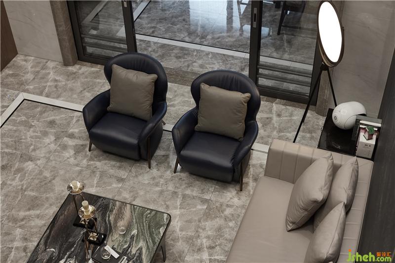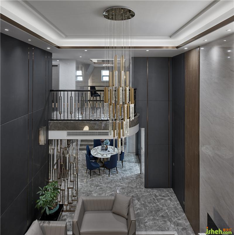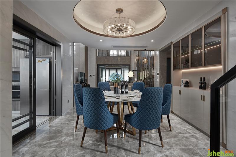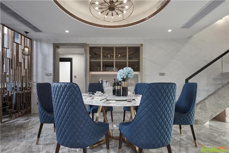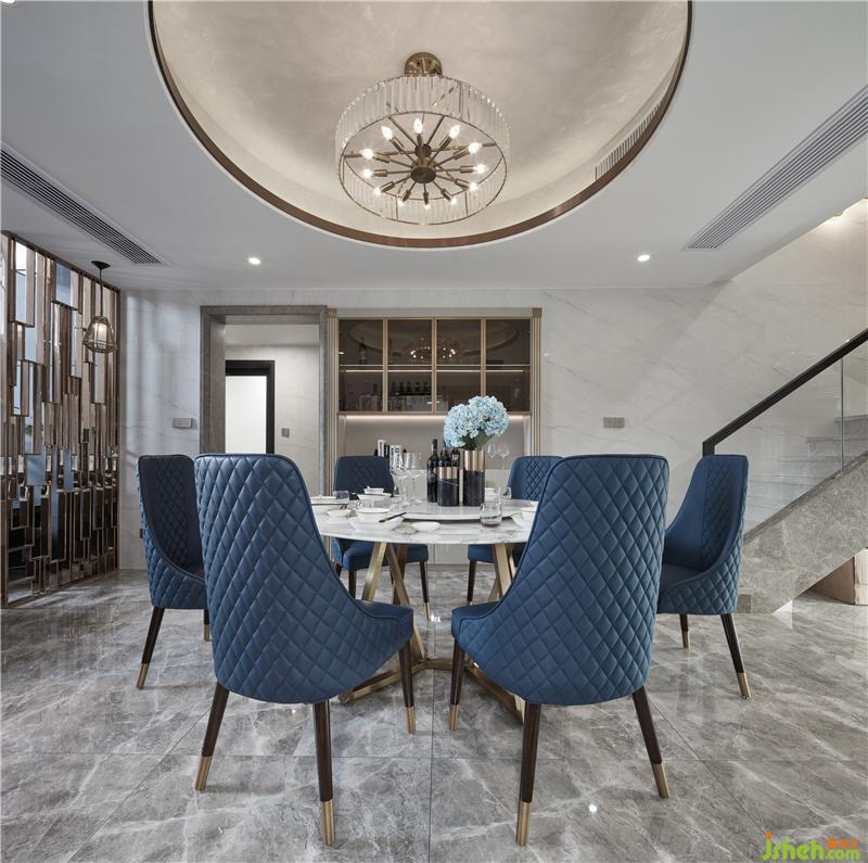 用餐區(qū)圓形天花與爵士白大理石圓桌形成上下呼應(yīng),鮮艷的藍色座椅帶來強烈的沖突感,為空間注入新的活力,營造輕松歡快的氛圍;室內(nèi)設(shè)計師將“雅奢”作為客餐廳設(shè)計的格調(diào)核心,以現(xiàn)代灰與白為主色基調(diào),以金屬的溫潤為氣氛內(nèi)核,用光線和家具、陳設(shè)的點綴使其煥發(fā)出藝術(shù)生命力。