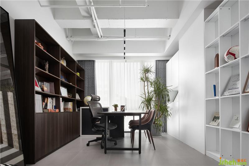 辦公設(shè)計(jì)空間的的大收納,進(jìn)門處的展示柜用來(lái)展示我們獲得的獎(jiǎng)項(xiàng)和一些紀(jì)念品;旁邊的收納柜用來(lái)收納各種與室內(nèi)設(shè)計(jì)有關(guān)的資料;背面的棕色書架與辦公桌相呼應(yīng),用來(lái)置放和儲(chǔ)放一些書籍、裝飾品等,空間整潔有序。光線投入落地窗照射進(jìn)來(lái),總監(jiān)辦公室通透又明亮。