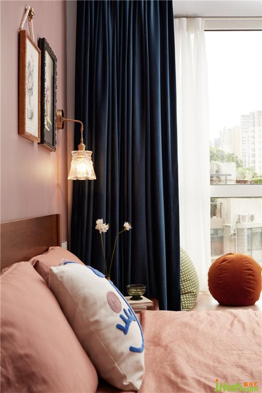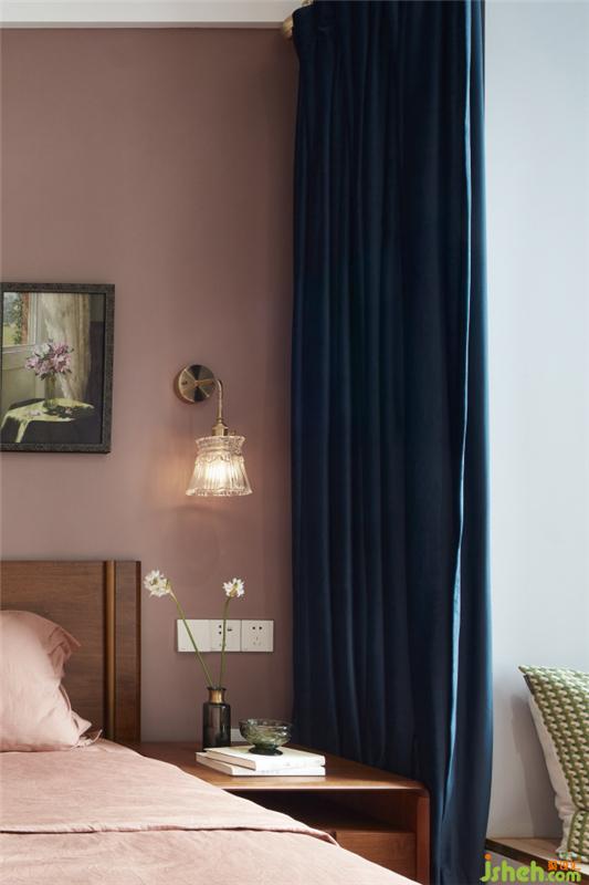 臥室墻面以臟粉色為底色,用白色和金色來描繪居家的形狀,再以飽和度高的藍色調(diào)和空間氛圍,營造一個溫柔、安寧、高級的休憩空間;在軟裝搭配上更加傾向細膩和溫馨,原木雙人床、舒適的床上用品、絨面窗簾、對稱的復(fù)古床頭壁燈散發(fā)出獨特柔軟的氣質(zhì),空間達到平衡。