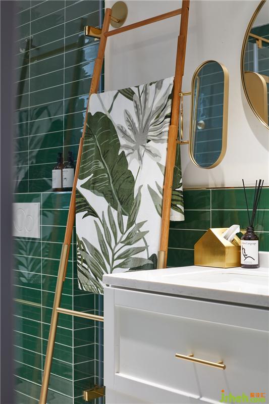 次衛(wèi)空間的裝修設(shè)計延續(xù)了客餐廳的整體色調(diào),白色的大理石紋地磚和墨綠色的小方磚、自然元素與現(xiàn)代金屬元素的結(jié)合,次衛(wèi)通透明亮,給人舒適自然之感。