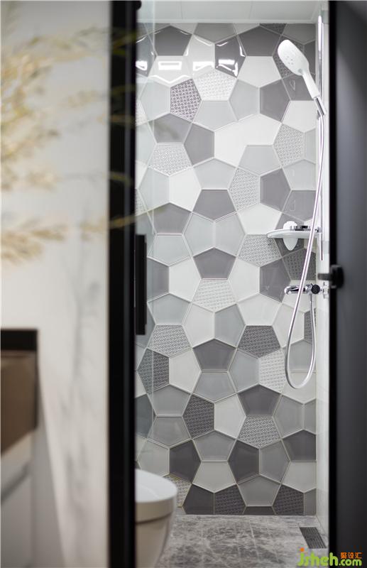 室內(nèi)設(shè)計師選擇綠色的六邊形瓷磚提亮空間色彩,也與客廳遙相呼應(yīng)。不同規(guī)格的五邊形玻璃瓷磚,有序的拼奏在墻壁上,構(gòu)造出一副別致的圖案,帶來視覺上的享受。