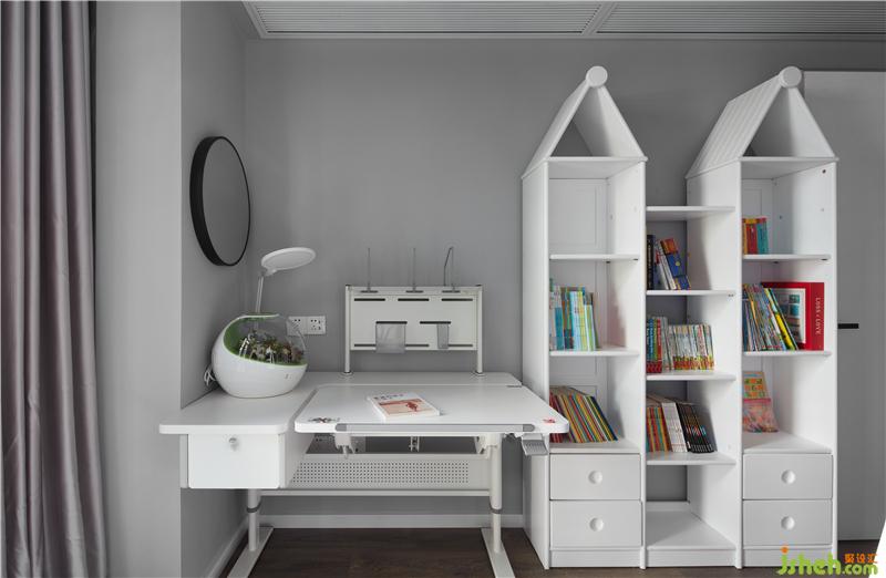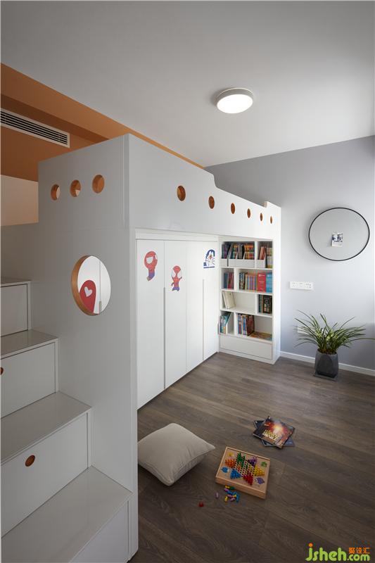 “上床下桌”的設(shè)計,讓小小的兒童房“蓬蓽生輝”。小孩有更多私人的玩??臻g,邊上的儲物柜可以收納書籍,也可以擺放小孩喜愛的物品。