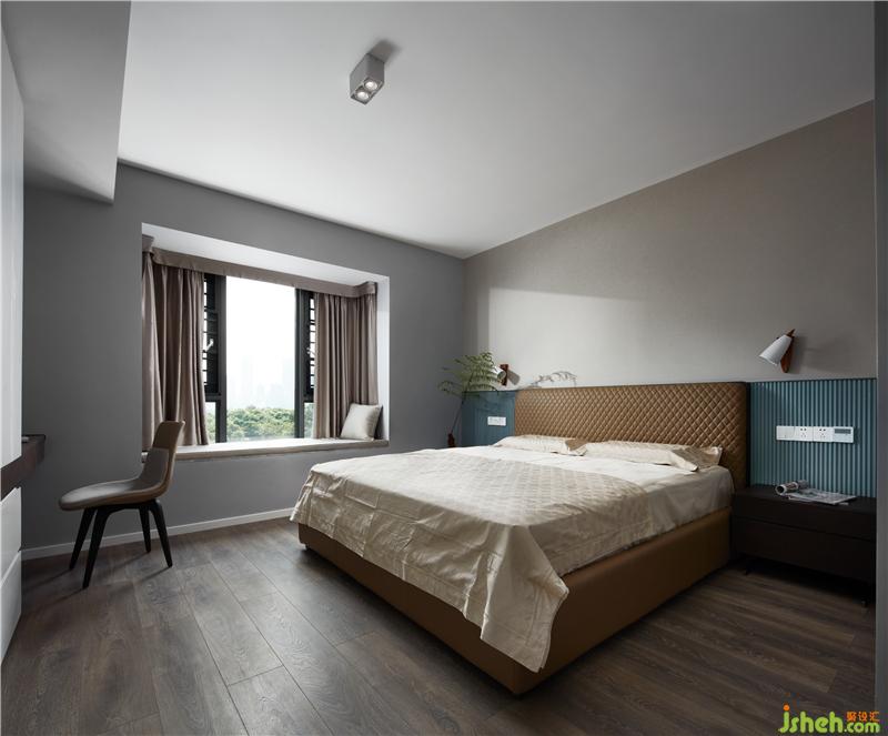 墻面的分色和床頭的拼色高度是連續(xù)呼應(yīng)的,整個空間更生動。床頭的霧霾藍(lán)波浪板,延伸劃出舒適的比例,空間形成包裹感,有助于產(chǎn)生安全感,更有助于睡眠。