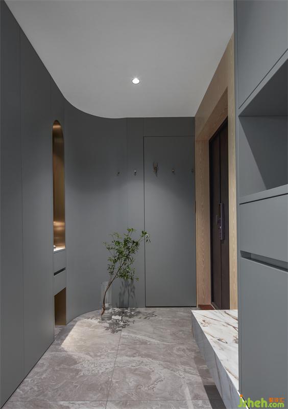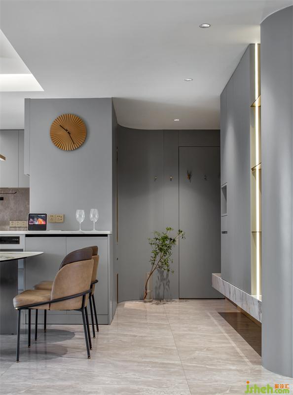 這個項目整體空間圍繞著現(xiàn)代風(fēng)格展開,弧形墻角是創(chuàng)造獨特空間的重要原則,是賦予空間深度、視覺豐富性和對比度的關(guān)鍵,客廳的書墻更是別具新意,灰色板材和木質(zhì)元素的結(jié)合,突出輕巧與精致,在和諧中變幻出具有現(xiàn)代之美的生活空間。