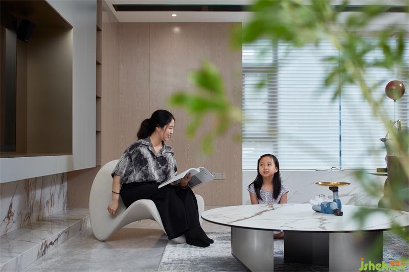 4、客廳沙發(fā)背后地臺延伸設(shè)計,增添親子互動兒童閱讀趣味性;