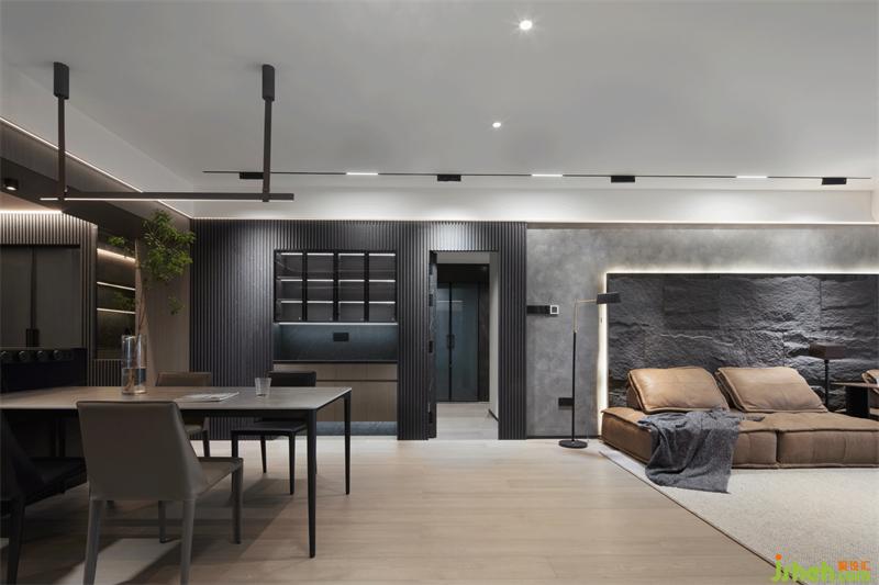 餐廳區(qū)域的天然取景框,將玄關(guān)劃分出來,啞光黑的巖板臺(tái)面,深圳家居設(shè)計(jì)搭配胡桃木元素,暗沉而高級(jí),在燈光的烘托下,大平層的既視感!采用木質(zhì)的長城板打造一個(gè)簡約大氣的背景墻,定制的原木餐邊柜鑲嵌于其中,在光與影的交錯(cuò)里,刻畫著生活的溫馨。