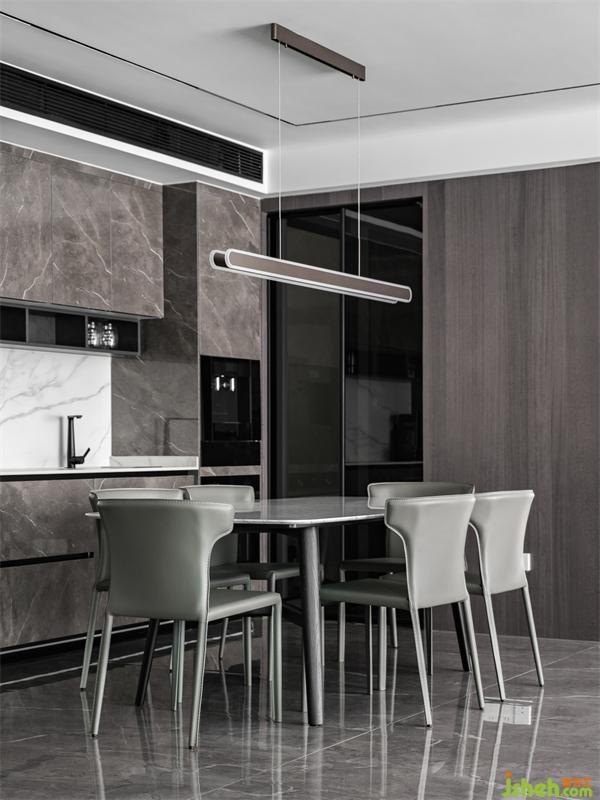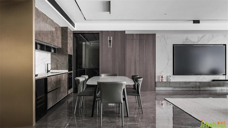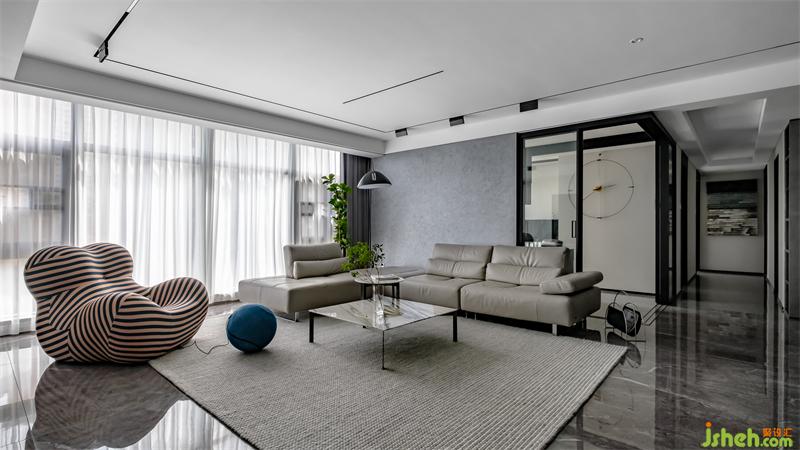原戶型采光非常好,直接感受落地窗的陽光洗禮,灰色系作為空間主調(diào),深圳家居設(shè)計(jì)沉穩(wěn)優(yōu)雅的高級(jí)感,皮質(zhì)的L型沙發(fā),背后的區(qū)域作為書房,通鋪亮面大理石瓷磚,好似一片水波紋,磁吸軌道燈拉伸縱深感,還能實(shí)現(xiàn)多種光影效果。