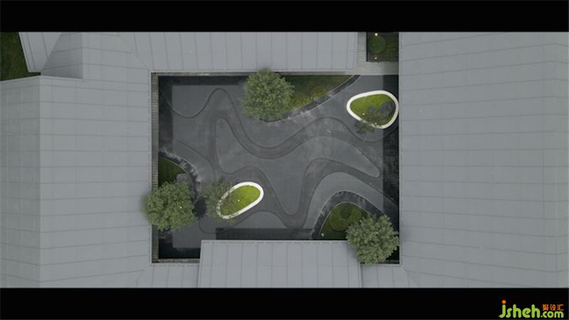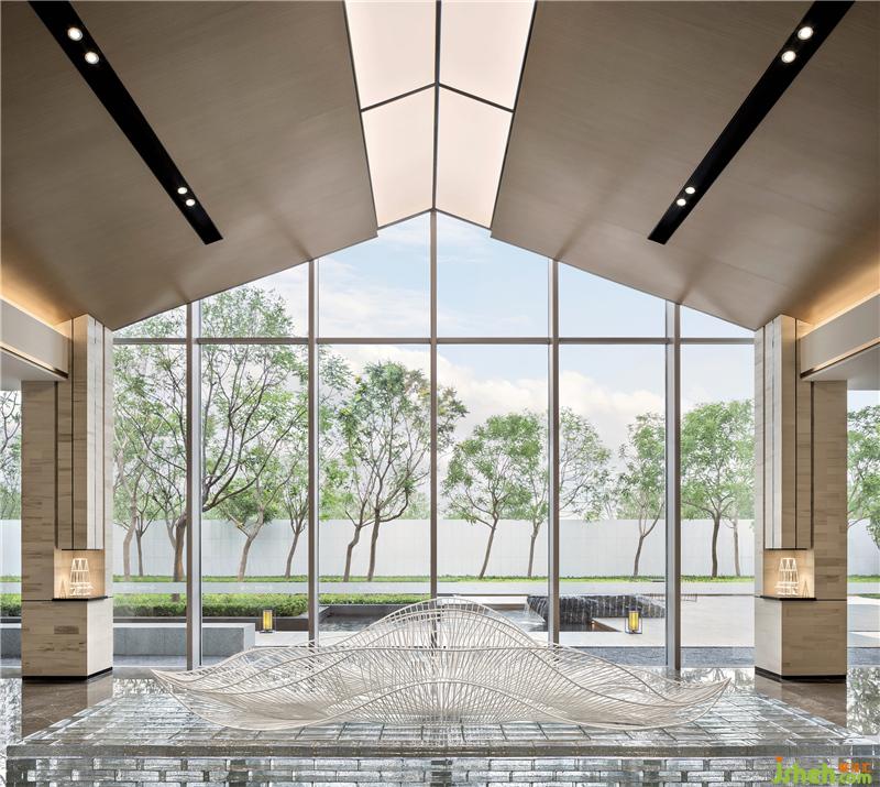 該項目位于薊州新城核心地塊,東臨人民公園,各級綠地與開放空間圍繞,擁有和諧的區(qū)域生態(tài)格局。山海藝術會館整體空間吸收了美國著名建筑師弗蘭克·勞埃德·賴特(Frank Lloyd Wright)所提倡的“追求空間表里一致性,注重比例與材料的運用”觀點,配合建筑呈內向合院與“四水歸堂”的特點,內部空間設計隨著時空的推進,依次為企業(yè)展廳、沙盤展示區(qū)、洽談區(qū)、觀景廊、兒童活動區(qū)等打造出空間序列——起承轉合、收放有度。