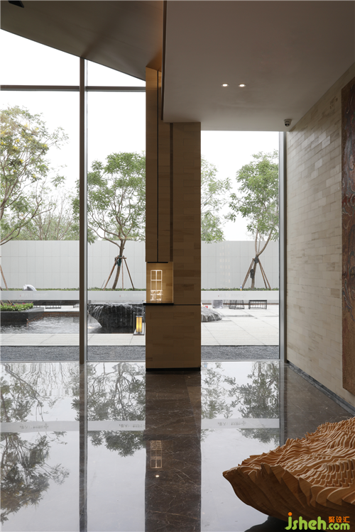 榫卯結構的藝術表達再次呼應賴特對于材料運用的觀點,在結合現代的功能與技術的基礎上,用榫卯結構的海螺與燈光墻面融合中國建筑符號與代表天地生息的海洋色彩。