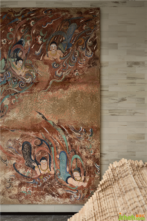 沙盤展示區(qū)右側結合了三處不同風格的藝術裝置——巖彩藝術敦煌泥板畫《“巖”述千年,天工開物》、榫卯結構海螺雕塑以及榫卯結構燈光墻。