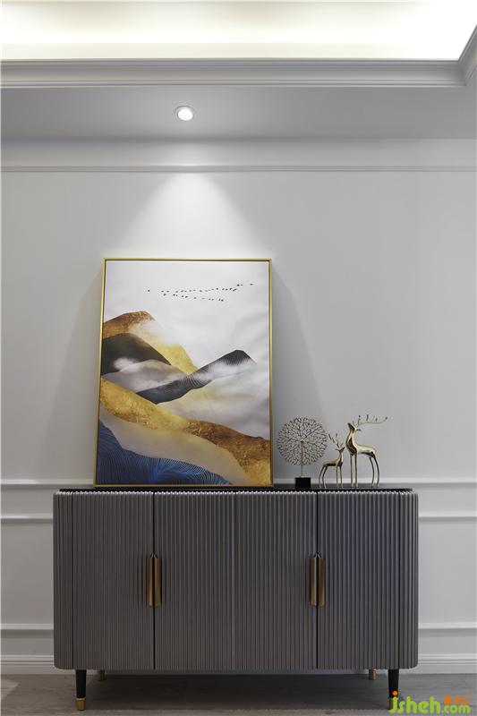 純潔的白色作為空間主體色,搭配簡潔利落的線條,沒有過多的裝飾,采用孔雀藍搭配橙色為客廳增添濃郁的色彩與背景裝飾畫相呼應。室內設計師