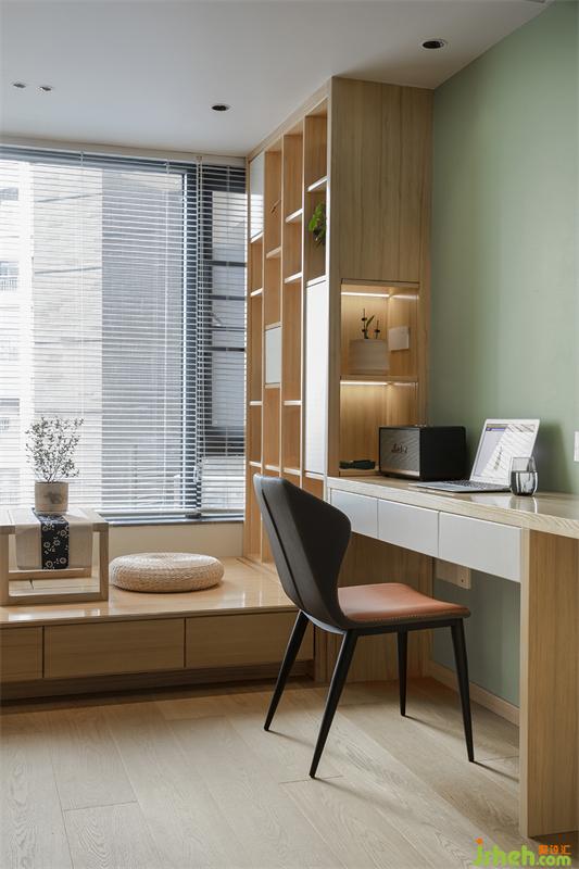 左邊設(shè)計了封閉式的柜門,斜邊暗拉手的設(shè)計延伸與右邊的層板柜橫板齊平;豎板用木色區(qū)分于白色柜門的設(shè)計手法,同時比柜門凸出1公分,視覺上顯得更流暢、立體感。
