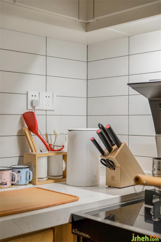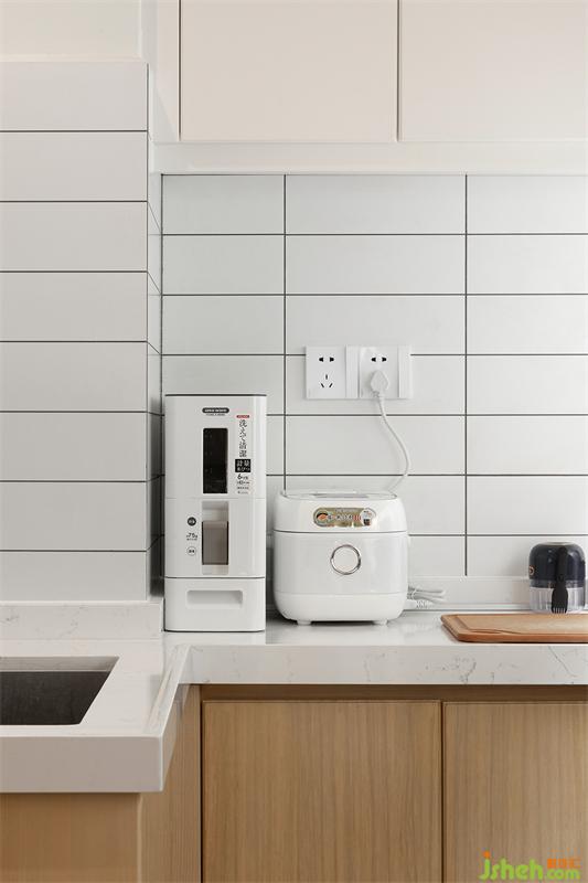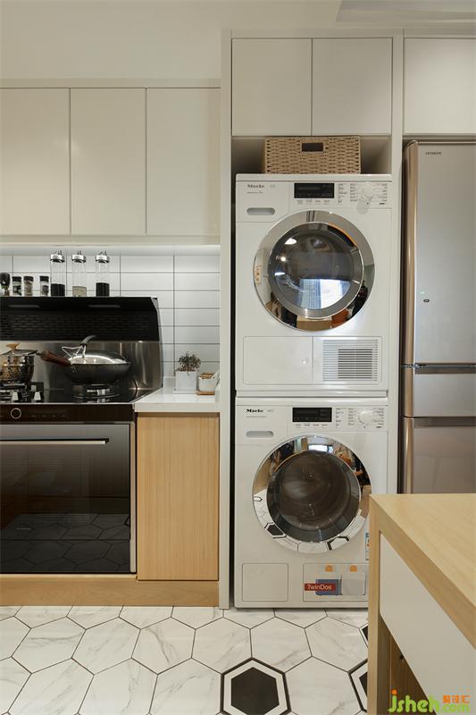 右邊是洗衣機、烘干機與冰箱位置,家居設(shè)計以預(yù)留冰箱高度尺寸為基準齊平烘干機的柜身,往上位置設(shè)計成柜門的儲物空間;左邊是集成灶臺設(shè)計,對于開放式廚房,集成灶的抽煙效果還是杠杠的!