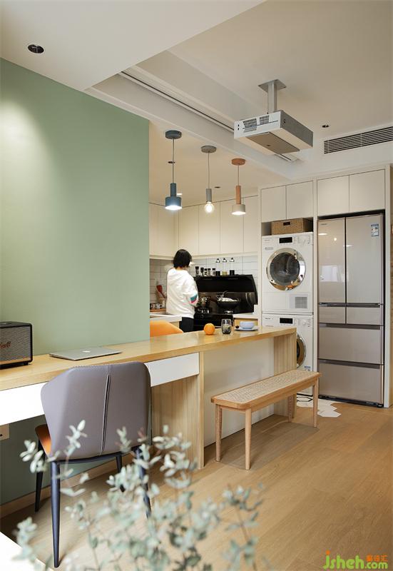 把原戶型廚房墻體打掉后,我們看到的是一個(gè)開(kāi)放式的廚房,餐桌是設(shè)計(jì)在廚房與客廳之間的位置,鏈接過(guò)去的是一個(gè)辦公桌,既延伸空間感,也增加與廚房、客廳的互動(dòng)性。;餐桌是廚房與客廳相互互動(dòng)的樞紐,餐桌下面做了可以儲(chǔ)物的功能,白色柜門(mén)的設(shè)計(jì)不會(huì)顯得沉重,反而視覺(jué)效果給人一種輕巧、自然的效果。辦公桌面對(duì)的是一副灰豆綠色的墻體。封閉墻體的設(shè)計(jì)讓這個(gè)區(qū)域顯得寧?kù)o、具有思考的空間。