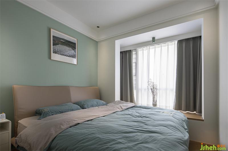 灰色調(diào)的布簾加上透光的紗簾,與豆綠色形成反差,增添了一份空間色彩。