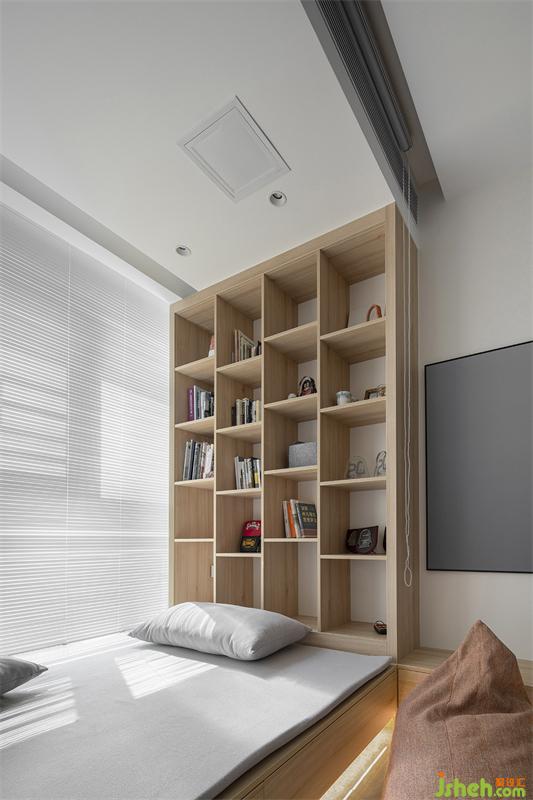 這是原來陽(yáng)臺(tái)的地方,現(xiàn)在打掉陽(yáng)臺(tái)墻體封窗戶,變成一個(gè)室內(nèi)的空間。設(shè)計(jì)成榻榻米休閑娛樂區(qū),是閑聊飲茶的地方,書吧,隱藏臥室,既是親子互動(dòng)活動(dòng)的區(qū)域;整個(gè)空間采用了榻榻米,外面是抽屜的做法,用來收藏小孩子的玩具、小物件;里面則是掀開的做法,收納比較大體的物體等;榻榻米一側(cè)設(shè)計(jì)了不同的書柜造型,白色的背板點(diǎn)綴使得它在木色中跳躍區(qū)分。