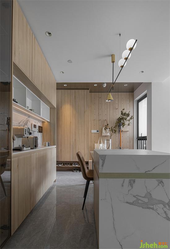 餐吧臺后面是操作臺面,因?yàn)闃I(yè)主的職業(yè)需求(甜品師),可以一邊做甜品一邊和餐廳、客廳形成靈性的互動空間。