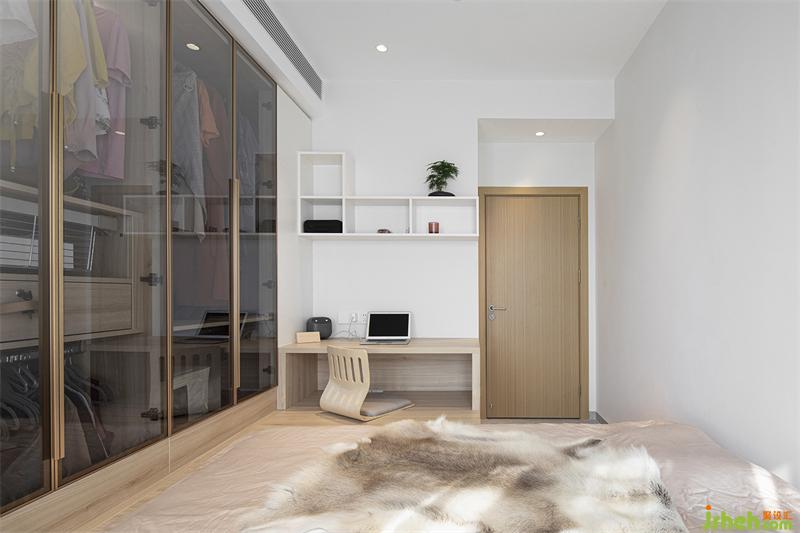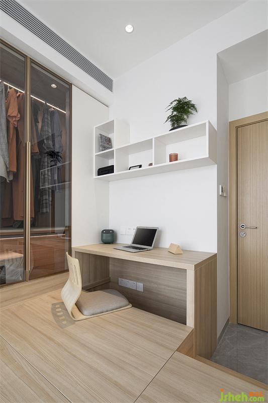 拐角處安置了書桌,上面一排干凈的白色墻柜與墻身顏色融合在一起,書桌預(yù)留了放腳的地方,可以放的舒舒服服!