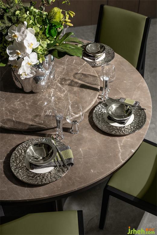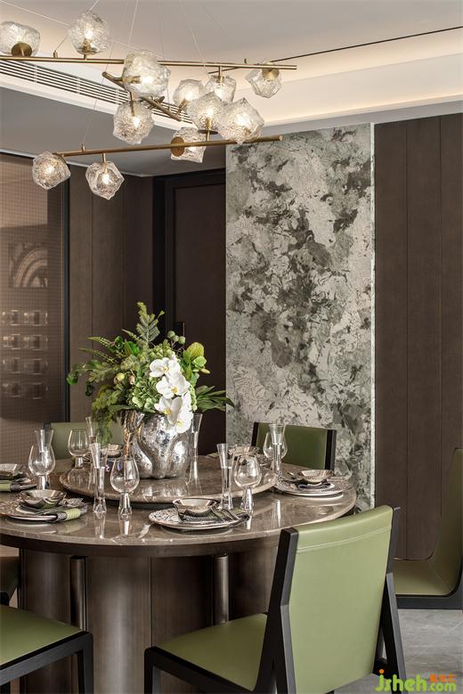 餐廳空間通透大氣,一體式的布局設(shè)計讓交流動線更加流暢。樣板間設(shè)計大理石餐桌與墻面互相呼應(yīng),華麗和內(nèi)斂的兩極碰撞,留出恰到好處的余韻。生機盎然的綠色點綴其間,俗世尋常躍然紙上。