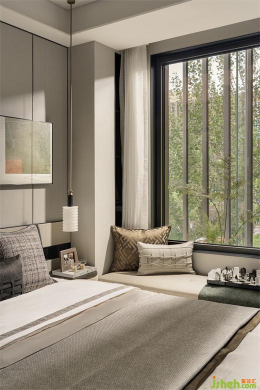次臥低調(diào)含蓄的床頭吊燈奠定空間基調(diào),空間中材質(zhì)肌理豐富卻內(nèi)斂,利用不同明度和色彩傾向的灰色賦予空間輕奢優(yōu)雅的品質(zhì)感。