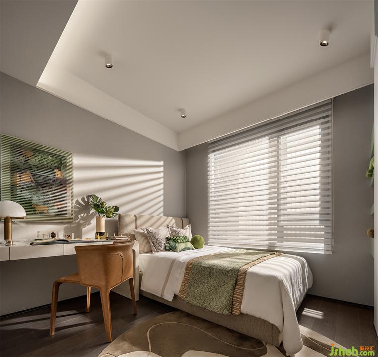 開(kāi)門見(jiàn)綠,沁人心脾。兒童房用綠意營(yíng)造氛圍,掛畫(huà)、書(shū)桌和綠植的不同介質(zhì)傳遞自然的信息,樣板間設(shè)計(jì)在陽(yáng)光的照射下溫柔呈現(xiàn),仿佛誤入自然之境,讓人情不自禁深入探索內(nèi)在的美好。