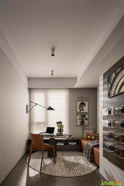 攝影主題的書(shū)房設(shè)計(jì)別具一格,亞克力透明陳列展示清晰明了,黑白灰的色彩彰顯理性的克制。樣板間設(shè)計(jì)藝術(shù)舒適的氣息彌漫整個(gè)空間,包容、隨性的生活理念也在此間蔓延。