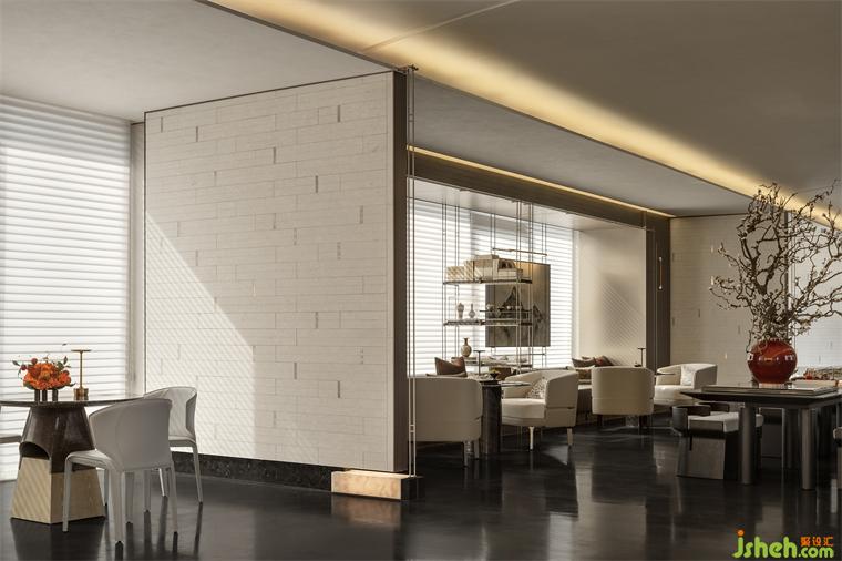 盡頭處,一抹朱紅猶如明亮的燭火,沉穩(wěn)中又不失華貴,盛唐風(fēng)韻撲面而來,再現(xiàn)繁榮昌盛的大唐氣韻,令人心馳神往。營銷中心設(shè)計柔和的光線與現(xiàn)代材質(zhì)的運用相得益彰,墻面仿佛張開溫暖的懷抱,包裹整個水吧臺,如玉般的溫潤恰到好處地輕撫空間每個角落,讓人心生寧靜、舒適。