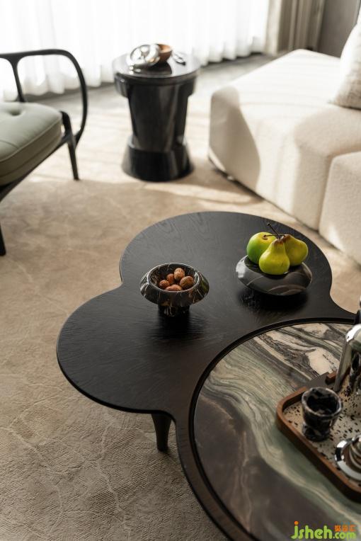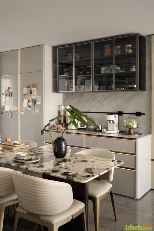 中央島聯(lián)動(dòng)餐桌與西廚,將用餐儀式感與生活煙火氣完美融合。大理石餐桌嵌套綠色島臺(tái),咖啡機(jī)的香氣與玻璃器皿的質(zhì)感交織。餐桌在早餐吧、臨時(shí)辦公桌、親子烘焙臺(tái)之間無(wú)縫切換,空間成為一場(chǎng)持續(xù)進(jìn)行的感官實(shí)驗(yàn)。