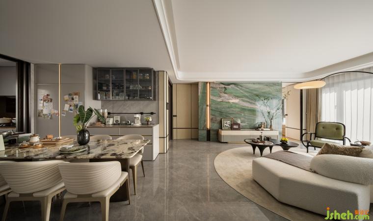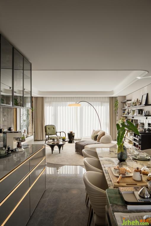 這是設(shè)計(jì)師為活力家庭量身定制的“生活劇場(chǎng)”。LDK一體化空間通過(guò)幾何形沙發(fā)與靈活桌椅布置構(gòu)建圍合式交流場(chǎng)景,可自由組合為咖啡研磨角、觀影空間或親子游戲場(chǎng)。6米通廳打破傳統(tǒng)邊界,背景墻以玉石般的光澤和紋路折射出自然意趣,懸浮書架層展示收藏的杯碟、書籍與音響,功能與展示的邊界在此消融。