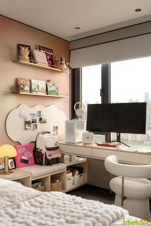 男孩房以汽車文化構(gòu)建機(jī)械未來感空間,為休憩場景注入趣味。女孩房以“星光造夢”為主題,將閱讀愛好與審美培養(yǎng)融入日常場景,打造出一個(gè)承載生活趣味與成長記憶的少女專屬空間。
