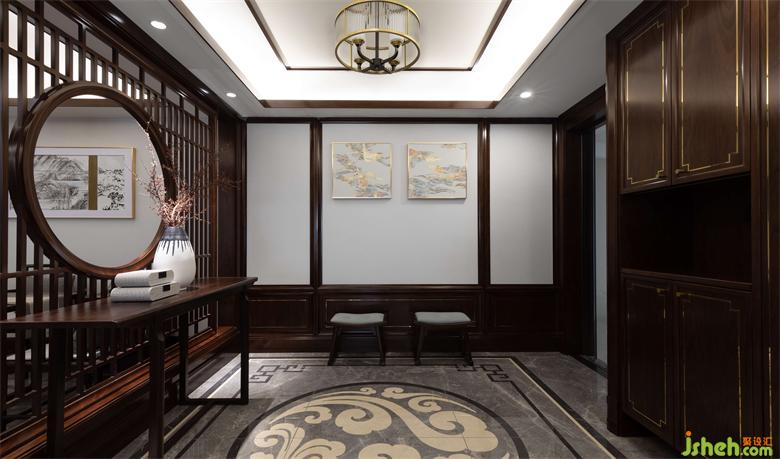 步入玄關(guān),展現(xiàn)眼前的胡桃木鏤空實木通花,給予人們強(qiáng)烈的心理暗示,即將要展開一段絢爛的時空之旅。